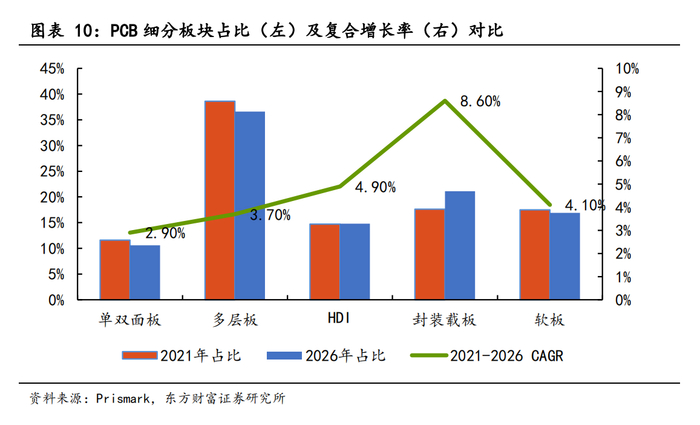 IC载板已成为PCB行业中规模最大、增速最快的细分子行业。据统计,2021年全球IC封装基板行业规模达到142亿美元,同比增长近40%,预计2026年将达到214亿美元(约1474亿元),2021-2026年IC载板CAGR为8.6%。
