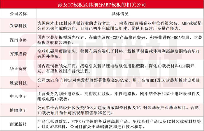 据不完全统计,目前涉及IC载板及其细分ABF载板的相关公司主要有兴森科技、深南电路、方邦股份、华正新材、胜宏科技、中京电子、博敏电子、南亚新材等,具体情况如下:
