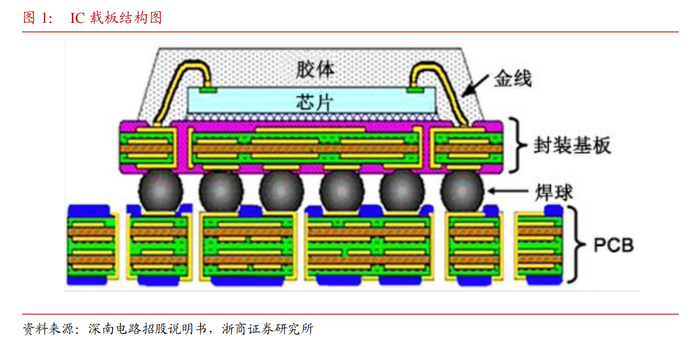 IC载板即封装基板,是芯片封装环节不可或缺的一部分。IC载板具有高密度、高精度、高性能、小型化及薄型化等特点,主要功能为搭载芯片,为芯片提供支撑、散热和保护作用。IC载板是芯片封装技术向高阶封装领域发展的产物,是集成电路产业链封测环节的关键载体。