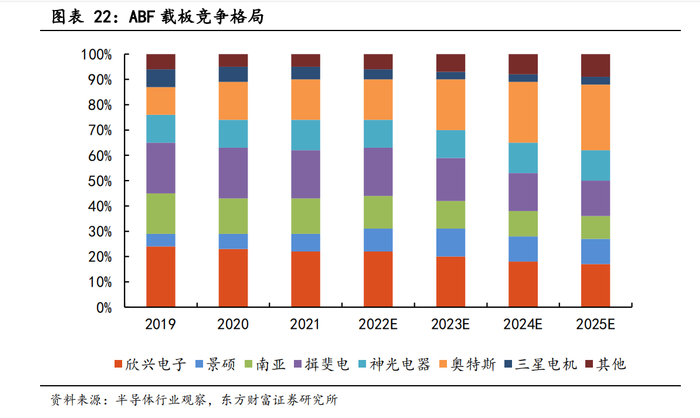 从ABF载板的竞争格局来看,目前欣兴电子、揖斐电和奥特斯三者占比较高,2021年其市占率分别为22%、19%和16%。预计新进入者及其他原有小规模供应商占有率将逐渐提升。