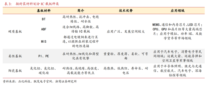按封装材料不同,IC载板可分为硬质封装基板、柔性封装基板和陶瓷封装基板。而硬质基板的主要材料为BT树脂、ABF树脂和MIS。ABF基板材料是由Intel主导的一种材料,用于生产倒装芯片等高端载体基板。