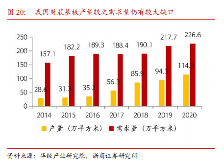 浙商证券分析师蒋高振近日研报指出,从供需情况来看,目前我国封装基板产量较之需求量仍存在缺口,进口依赖程度较高,IC载板国产化进程刻不容缓。