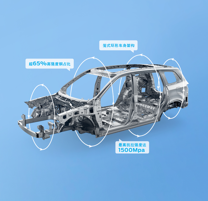 对于百年福特而言,安全和品质始终是福特坚守的底线。在被动安全方面,福特新领裕拥有同级领先的安全配置,为驾乘者带来越级安全感。全车车身主要由多种高强度钢组成,占比高达65.4%。其中热成型硼钢强度高达1500Mpa,达到航空飞机起落架的强度级别。高强度车身可有效抵御各方向的直接撞击,最大程度减小车身结构变形。全系标配7个安全气囊。同级独有的主驾驶膝部气囊以及一至三排贯穿式侧气帘,最大程度保障车内人员安全。