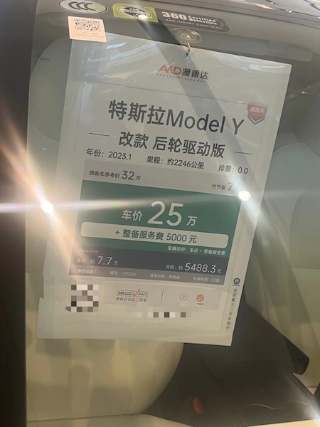 记者在探访过程中注意到,一辆车辆年款为今年1月、行驶里程2246公里的特斯拉改款后轮驱动版Model Y,当时车主购车参考价花费大概32万元,而仅仅一个月过去,该车价现在为25万元。