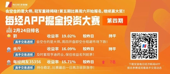 【会空仓的是大师,冠军重磅揭晓!第五期比赛周六开始报名,继续赢大奖!】周五,每日经济新闻APP举办的掘金投资大赛第四期正式赛顺利结束。冠军“劉”周四已空仓规避市场下跌,最终收益率19.02%,亚军“余尺”收益率16.09%,季军“每经网友35356”收益率15.71%,恭喜所有正收益率的获奖选手!第五期正式赛下周举行,报名时间为2月25日至3月8日,比赛时间为2月27日至3月10日。比赛结束时收益率为正就能获奖,前十名的现金奖励更加丰厚!赶快下载安装每日经济新闻APP,继续报名参赛赢取现金大奖!