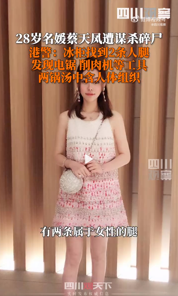 据四川观察官方微博,香港警方公布蔡天凤碎尸案细节:冰柜中发现2条腿,凶手准备的电锯等工具,还有两锅混有人体组织的汤。