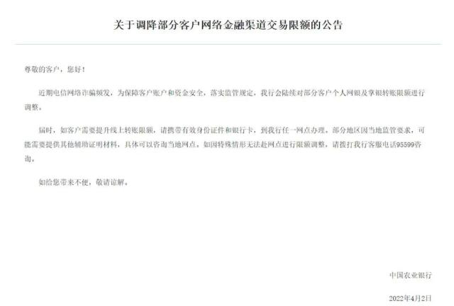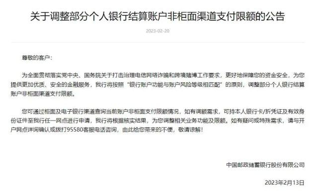 上述公告均表示,为全面贯彻落实打击治理电信网络诈骗和跨境赌博工作要求,更好地保障用户的资金安全,提供更加优质、安全的金融服务,将按照“银行账户功能与账户风险等级相匹配”的原则,调整部分个人银行结算账户非柜面渠道支付限额。