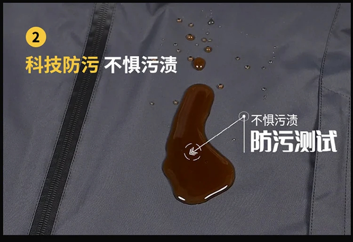 纳米三防科技,全面升级,面料柔软具有防水、防风、防污等功能,污渍遇上外套表层便凝结成水珠。