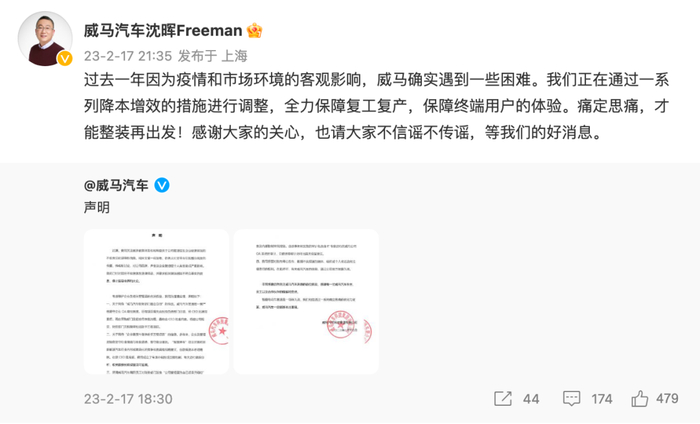 随后,沈晖转发该微博至个人社交平台,并配文表示:“过去一年因为疫情和市场环境的客观影响,威马确实遇到一些困难。我们正在通过一系列降本增效的措施进行调整,全力保障复工复产,保障终端用户的体验。痛定思痛,才能整装再出发!感谢大家的关心,也请大家不信谣不传谣,等我们的好消息。”