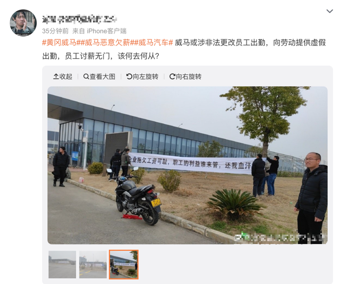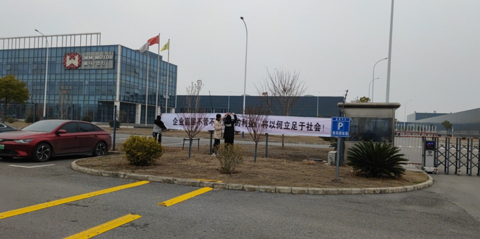 据《电车报告》获悉,由于威马拖欠员工工资,已有员工到威马黄冈工厂维权。据相关图片显示,疑似威马员工将白色横幅装订在威马工厂门口,横幅上写着“执行劳动合同第八十五条,要求支付经济补偿金”、“企业拖欠工资可耻,职工的利益谁来管,还我血汗钱”、“企业高管不管职工利益,将何以立足于社会”。