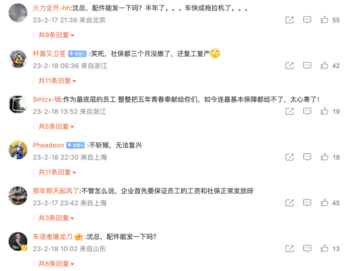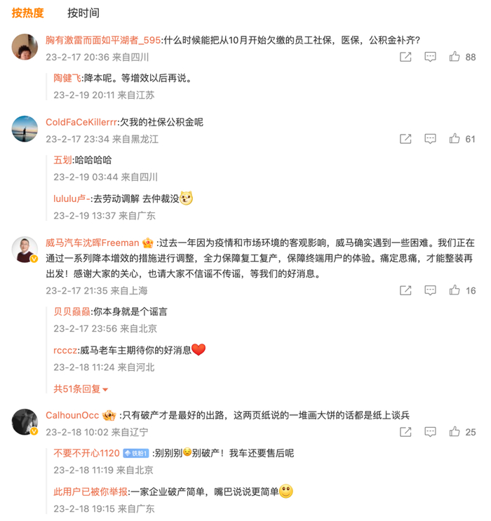 在威马汽车及威马汽车董事长沈晖微博下方,参与索要工资的人数不胜数。