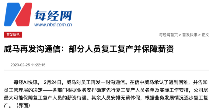 报道称,本次发布沟通信时间正好是威马汽车2月份发薪日,大部分员工均未收到工资,直接进入无薪休假的状态。属于复工复产人员名单、能拿到2月薪资的员工少之又少。