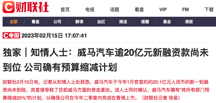 需要注意的是,为了自救,威马汽车不得不通过上市途径解决资金难题。今年1月12日,威马汽车宣布:“Apollo智慧出行集团有限公司(香港联交所股份代号:860)与威马集团达成有条件买卖协议,并建议配售股份款项总额将约为39.18亿港元,建议临时融资约人民币7.2亿元。同时,威马持有股东承诺常备融资15亿港元。”一位接近威马汽车人士曾表示:“如果一切顺利,威马汽车预计在今年二季度完成港股挂牌。”按照计划,威马汽车逾20亿元新融资原定在2月份到账,但截至2月15日,该笔融资仍未到账,这也是直接导致威马再度陷入资金紧张的原因之一。