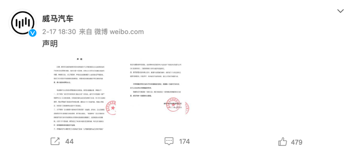 一周前,威马汽车在其官方微博发布澄清声明,并表示:“我司关注到多家媒体发布和转载关于公司管理层及企业经营状况的不实言论和误导性信息。相关文章一经发布,在各大社交平台引起部分网友的传播、转载和讨论,对公司品牌、声誉及企业管理层个人名誉造成严重影响。我司已针对部分不实信息发送律师函,并要求相关媒体删除不符合事实的信息,停止误导业界和大众。”声明中还针对“威马汽车财务部门擅自立项”、智慧停车项目“企业靠黄牛刷单的千万级项目”、某威马汽车离职员工称“公司管理层为自己项目开绿灯”三项传闻做出回应和澄清。