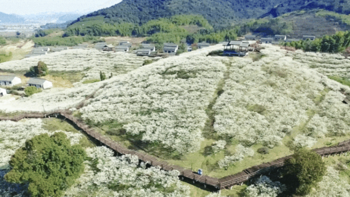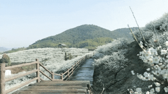 原乡小镇景区有着千亩梅林、万株梅花的“瀛洲梅园”,每年的二三月,这里漫山遍野的白梅、红梅、绿萼梅等各色梅花竞相绽放,与山野相互映衬,美不胜收。梅园还建有长三角地区最长的梅林观光木栈道,总长约4.8公里,并设有12座观梅亭,串联起一条游客赏梅、闻香、观景、留影的绝佳路线。目前梅花正陆续进入盛放期。