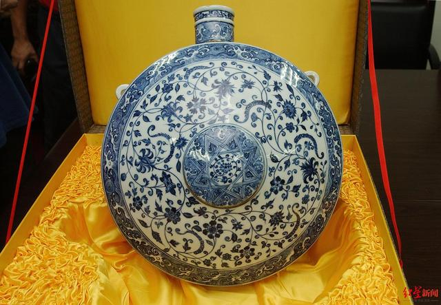 景德镇制明永乐青花缠枝莲纹双环耳扁平大壶,仿自阿拉伯铜器式样。