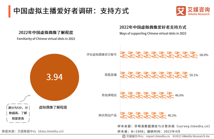 调研数据显示,受访用户对虚拟偶像的了解程度较高,分数为3.94。有68.0%的虚拟偶像爱好者会通过评论虚拟偶像官方账号的方式来支持虚拟偶像。艾媒咨询分析师认为,社交平台的官方账号成为虚拟偶像的主要宣传方式,使得虚拟偶像与消费者的互动更加便捷。