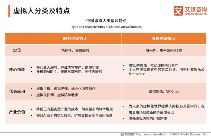目前,虚拟人主要分为服务型虚拟人和身份型虚拟人。服务型虚拟人具有功能性,能够替代真人服务,完成内容生产以及一些简单的工作,降低已有服务型产业的成本。身份型虚拟人具有身份性,多以虚拟IP或偶像呈现,能够为未来的虚拟世界提供人的核心交互中介。