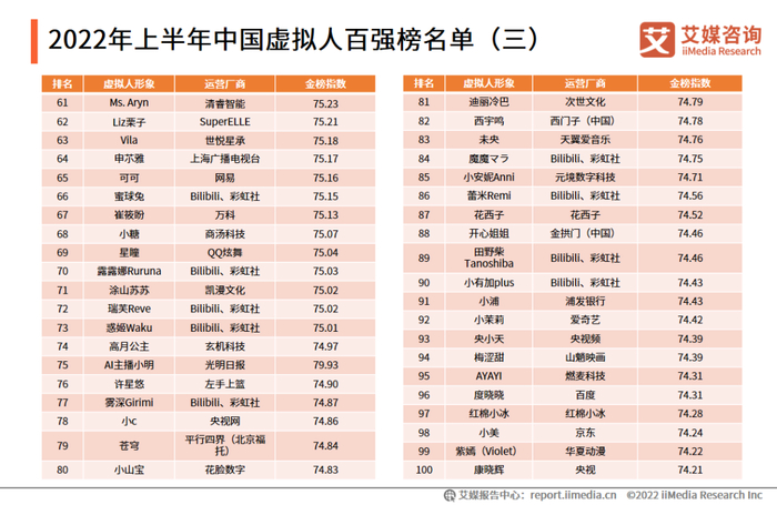 本次上榜《2022年上半年中国虚拟人百强榜》的虚拟人形象有洛天依、柳夜熙、嘉然、泠鸢yousa、乃琳等。其中,洛天依排名第一,柳夜熙和嘉然分别为第二名、第三名。