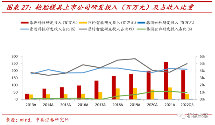 2)韩国世和:成立于1981年,主营轮胎模具(生产铸模、雕刻模具、容器)、轮胎制造设备(轮胎成型机、轮胎成型鼓、硫化机)、航运和租赁建筑物等。韩国世和业务与豪迈科技重合度高,在2013年以前为国际最大的轮胎模具公司, 2015年收入开始下滑,2016年主业开始亏损且不断扩大,2022年上半年收入规模仅1.38亿元,为豪迈科技同期模具收入的8%,行业市占率不断下滑;主要是因为韩国世和研发投入过低,导致产品竞争力下降、经营不善等。