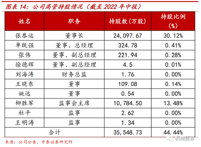 管理层持股充分。公司实际控制人是董事长张恭运先生,直接持有公司30.12%股份。大股东柳胜军为公司监事会主席,直接持有公司13.48%的股份。张恭运先生、柳胜军先生为公司最初创始人,上市以来从未减持与质押,张恭运先生在2021年第四季度增持0.06%,可见大股东在经营上有定力、有格局。公司管理层充分持股,截至2022年中报合计持有公司44.44%股份,利益绑定充分,有助于增强决策执行能力,最终使得公司价值趋向最大化。