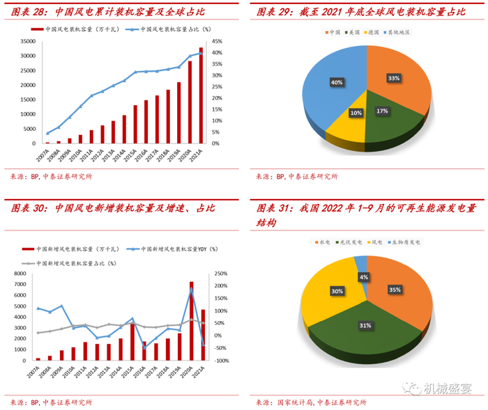 我国风电发展迅速,装机量稳居世界首位。截至2021年底,我国风电累计装机容量突破3.28亿千瓦,全球占比39.88%,居世界首位;美、德分别位居第二、三,装机量分别为1.33亿千瓦、0.64亿千瓦。2021年,我国风电新增装机容量4,686.08万千瓦,全球占比50.33%。从我国2022年1-9月的可再生能源发电量结构来看,水电、光伏发电、风电、生物质发电占比分别是35.22%、31.06%、30.19%、3.52%,同比增速分别是5.73%、28.78%、17.17%、14.82%,风电增速较快。