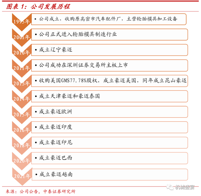 公司深耕轮胎模具行业22年,已成为业内龙头。公司成立于1995年,前身是高密第一纺织机械厂的一个机修车间;2001年12月,公司正式进入轮胎模具制造行业;2011年6月,公司在深交所主板上市。为加强国内市场拓展及客户服务,公司2010年成立辽宁豪迈,2013年成立昆山豪迈,2014年成立天津豪迈,并超越韩国世和成为全球轮胎模具龙头。