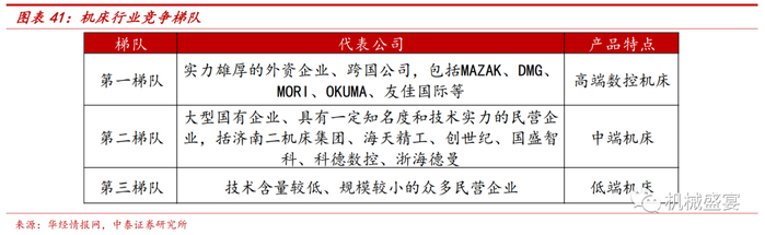 机床行业竞争格局:第一梯队主要为外资企业。机床行业竞争中的第一梯队为实力雄厚的外资企业、跨国公司,包括MAZAK、DMG、MORI、OKUMA、友佳国际等,产品集中在高端数控机床。第二梯队为大型国有企业、具有一定知名度和技术实力的民营企业,括济南二机床集团、海天精工、创世纪、国盛智科、科德数控、浙海德曼,产品集中在中端机床。第三梯队为技术含量较低、规模较小的众多民营企业,集中在低端机床。在军工、新能源汽车、光伏、风电、工程机械、船舶海工带动下,中国机床行业有望加速高端机床领域进口替代的脚步。