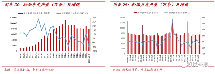 全球轮胎模具市场规模约100-150亿元。整体来看,全球轮胎模具行业没有明确的市场统计口径,据公司投资者交流公告,全球轮胎模具市场空间在100-150亿元左右。受益于汽车行业复苏以及新能源车持续放量,国内轮胎生产在2022年11月同比为负转正且增速不断加快,叠加轮胎子午化率的不断提高,轮胎模具需求有望持续增长。