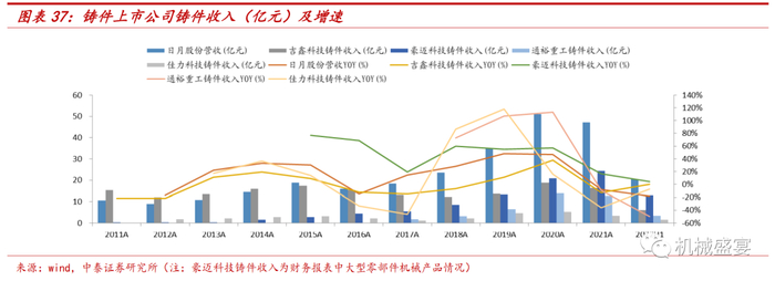 ③我国铸件产量全球第一,风电铸件产能集中。根据Modern Casting数据,2021年中国铸件产量5405.00万吨,占全球产量的52.81%。全球风电铸件制造产能中80%以上集中在中国。国内生产风电铸件的企业有20-30家,产能较为集中。豪迈科技目前铸件产能已达到24万吨,产能快速扩张,近几年公司铸件收入规模呈现稳定增长趋势,2022年上半年铸件盈利水平高于同行。