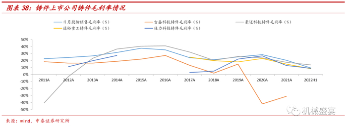 1)日月股份:风电铸造行业龙头,产能优势明显。日月股份成立于1984年,主营大型及特大型重大装备铸件,已成为装备先进、技术力量雄厚、多品种、批量生产的国内最大的铸造生产企业之一,以生产“厚大断面球铁铸件”见长,处于铸造行业的龙头地位;2022年上半年,日月股份实现营业收入20.40亿元,同比下降18.01%;毛利率为9.47%,同比下降17.29pct。2022年上半年由于市场需求下降及疫情叠加影响,公司产品销量出现下降,从而导致业绩下滑。截至2022年6月底,公司已经形成48万吨铸造产能,成为全球风电铸件和注塑机产品的主要供货商。