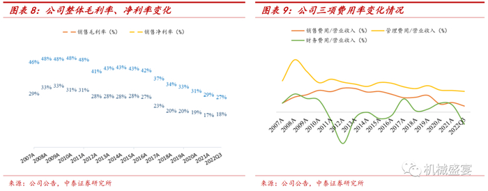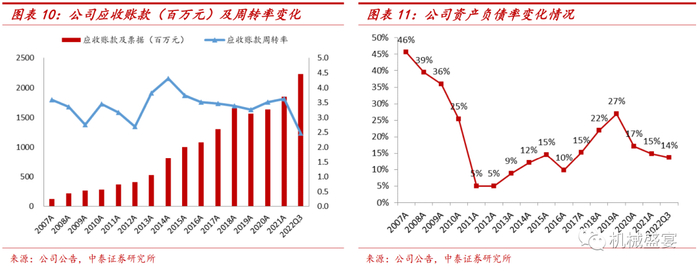 应收账款周转率回升,资产负债率有所降低。随着公司业务规模快速增长,应收账款规模增长管控好;2022年前三季度,公司应收账款及票据为22.29亿元,同比下降11.59%,应收账款周转率为2.47,同比下降0.18。随着公司生产规模的不断扩大,公司2012-2019年资产负债率稳步上升;2020年以来,公司的负债呈现逐年下降趋势,同时公司资产逐年增长,资产负债率明显下降,公司偿债能力增强;2022年前三季度,公司信用等级相对较低的已贴现未到期票据减少,资产负债率有所下降。随着公司各项业务发展成熟,产能完善,公司资产负债率有望降低,资本结构将进一步优化。
