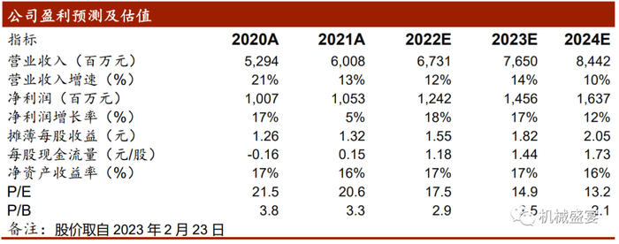公司作为轮胎模具行业龙头,有望受益于疫情管控放松、新能源车放量以及汽车行业的复苏,轮胎模具业务将持续放量。2022年上半年公司铸件盈利水平高于同行,近几年铸件收入稳定增长,同时公司海外客户优质,产能扩张迅速,预计铸件业务有望稳定增长,增厚公司业绩。同时,公司积极布局机床业务,于2022年已实现机床产品销售,贡献当期收入,并且我们预计2023-2024年机床行业景气度较高,公司有望充分受益,实现机床订单与收入快速增长。我们看好公司的发展,上调公司业绩,预计2022-2024年公司归母净利润为12.42、14.56、16.37亿元(前值为12.04、13.24、14.14亿元),对应PE分别为17、15、13倍,维持“增持”评级。
