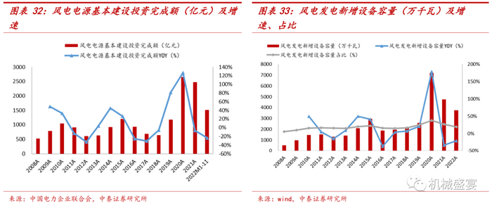 ①风电需求放量可期,投资有望边际改善。2021~2022年风电项目受疫情因素影响进度滞后,风电发电新增设备与基本建设投资完成额有所回落;2022年1-11月我国风电电源基本建设投资完成额为1511亿元,同比下降23.80%;2022年风电新增设备容量为3763万千瓦,同比下降21.00%。随着发电侧平价上网落地,需求将成为行业景气度的主导因素。“十四五”期间风电有望加速向替代能源发展,叠加疫情管控放宽,预计风电建设需求将明显放量,风电投资有望边际改善。