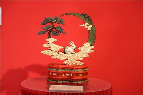 此次展览的作品囊括了金漆镶嵌、雕漆、花丝镶嵌等多种工艺作品80余件(套),均为北京金漆镶嵌艺术博物馆联合燕京八绝工艺美术大师及传承人自主研发设计、围绕兔年主题进行创作,其中不乏大量新锐青年设计师的作品,不仅体现了国家级非遗金漆镶嵌的工艺技法,还融合了满、藏、汉等多民族文化艺术装饰特色,展现了新时代非遗传承人的极致匠心与创新风采。