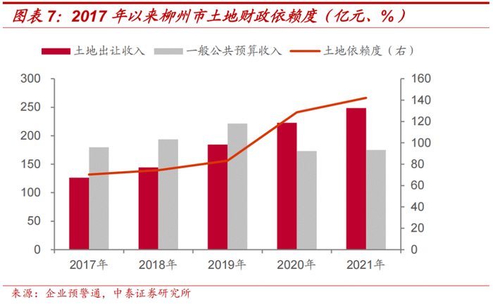 政府性基金收入自2017年起呈稳步增长趋势,且从2020年开始超过一般公共预算收入,其中2018-2021年同比分别增长14.96%、25.35%、21.20%、13.10%。2017年以来,柳州市土地出让收入逐年增长,土地财政依赖度随之持续上升,2021年土地财政依赖度为142.11%。