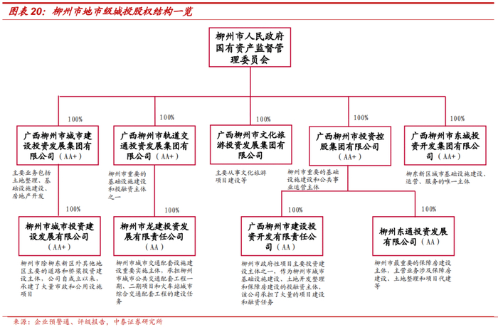 5家AA+级平台为广西柳州市投资控股集团有限公司(以下简称“柳州投控”)、广西柳州市东城投资开发集团有限公司(以下简称“柳州东城”)、柳州市城市投资建设发展有限公司(以下简称“城投公司”)、广西柳州市轨道交通投资发展集团有限公司(以下简称“柳州轨道交通”)、广西柳州市城市建设投资发展集团有限公司(以下简称“柳州城建”)。