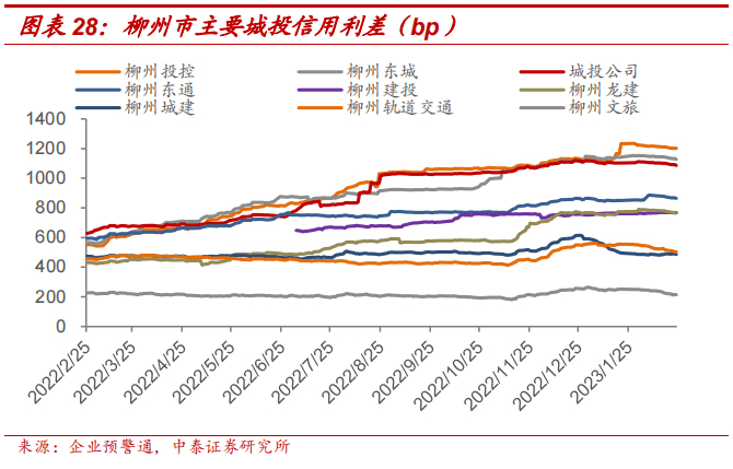 从具体主体信用利差看,2023年2月23日,存续债余额较大的柳州投控、柳州东城和城投公司信用利差超过1,000bp;柳州东通、柳州建投和柳州龙建信用利差在700-900bp之间;存续债余额较小的柳州城建、柳州轨道交通和柳州文旅信用利差小于500bp。