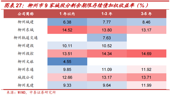 从存续债加权收益率看,柳州东城、柳州投控和城投公司存续债加权收益率较高。