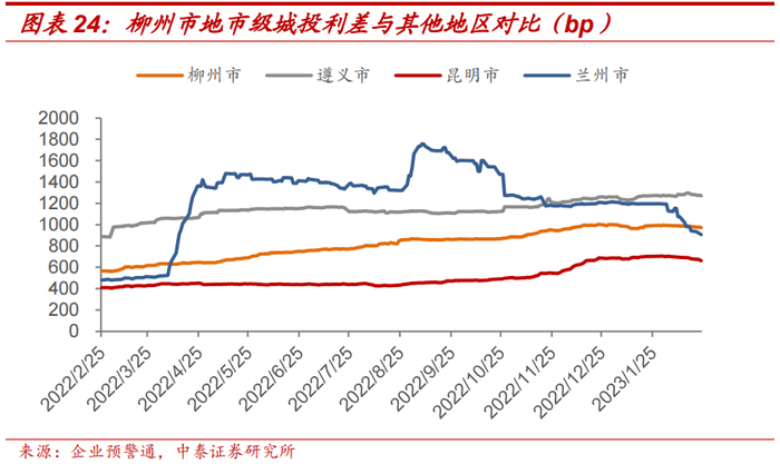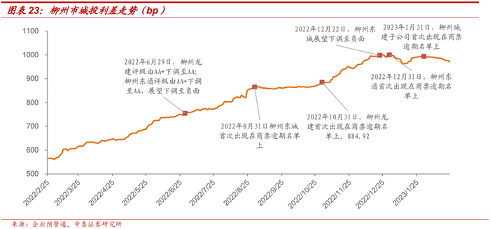 二级市场看,2022年以来,伴随着区域内负面舆情不断,柳州市信用利差呈上行态势,2022年11月11日总体利差较2022年年初[1]上行342.00bp,2023年2月17日利差较2022年年初上行405.82bp。