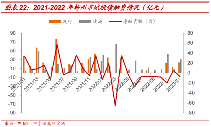 柳州市的负面舆情集中于2022年。上半年,柳州东通、柳州龙建及柳州投控陆续公告注销土地使用权。在此之前,仅2016年2月财综[2016]4号发布后,承担土地储备职能的城投为剥离土储职能,将土地储备返还给正规土储中心,但甚少有城投公告注销土地使用权。同时,公告中虽称“柳州市财政及柳州市国资委将通过现金资产和实物资产注入的方式增资”,但彼时注销土地使用权确实导致了相关城投净资产的大幅下降,因此三家城投公告引发了市场对柳州市整体的担忧。