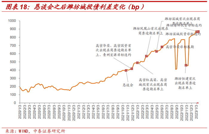 2021年10月20日,潍坊市召开投资机构对接大会[7],由潍坊市政府主办,潍坊市地方金融监管局承办。会上潍坊市相关领导表示,潍坊有实力也有能力,绝不让任何一家国企出现债券违约风险,绝不让任何一个区域陷入债务危机,并提出四项措施管控风险。一是筹划设立规模50亿元的债务增信专项资金和80亿元的债券投资基金,如市内国企出现债券兑付风险时,债务增信专项资金先行垫付,避免违约风险;二是坚持风险防控全市一盘棋,对全市国企债务风险防控实行统一领导,强化资源统筹,压实属地责任,完善追责机制;三是对资产负债率较高、效益下滑明显的企业进行重点监控,密切监测债务变动情况,确保一有风险,立即处置;四是加快国企市场化转型,提升国企信用评级,聚焦产业发展,同时利用好权益市场,增强直接融资能力。