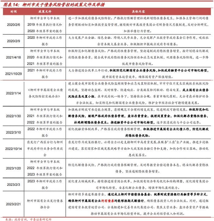 债务管控方面,广西曾于2020年7月16日召开债券市场投资者恳谈会,近年来柳州市预算执行报告及政府工作报告中均有涉及化债、防控债务风险的表述。2023年2月21日,柳州市召开恳谈会,提及“柳州将持续做好债券市场的风险防范工作,完善企业债券风险预警机制,实时监控到期债券的兑付安排,提前逐笔督促落实偿债资金来源。柳州市将持续拓展融资渠道,通过成立柳州市偿债准备基金、统筹财政资源银行再融资等多种方式,多渠道筹措资金,确保柳州市属国有企业所有债券均能够按期足额偿付,确保债券投资人的合法权益,坚决维护好柳州的良好资本市场环境和信任基础”。[1]