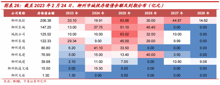 具体主体看,柳州投控、柳州东城、城投公司和柳州东通存续债余额规模较大,分别为206.38亿元、147.25亿元、125.52亿元和122.33亿元。2023年到期规模较大的主体为柳州投控和柳州东通,到期规模分别为33.10亿元和29.34亿元。