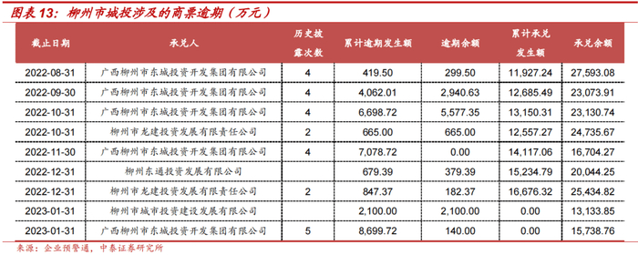 下半年,多家城投陆续出现在商票逾期名单上。 8月31日,柳州东城首次出现在商票逾期名单上,随后柳州龙建、柳州东通、城投公司陆续出现在商票逾期名单上。