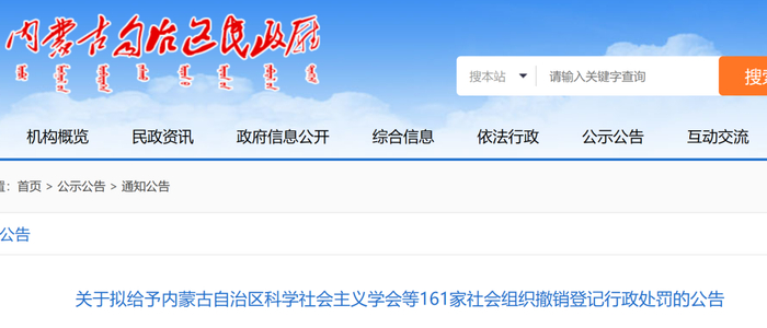 关于拟给予内蒙古自治区科学社会主义学会等161家社会组织撤销登记行政处罚的公告