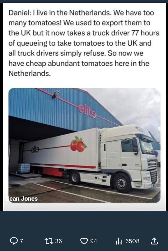 名叫丹尼尔的荷兰网友在社交媒体上发帖指出,“我们有充足的西红柿!过去(‘脱欧’前)我们总是会出口给英国,但现在(‘脱欧’后)一个卡车司机光过关就要77个小时,谁还会去呢?”