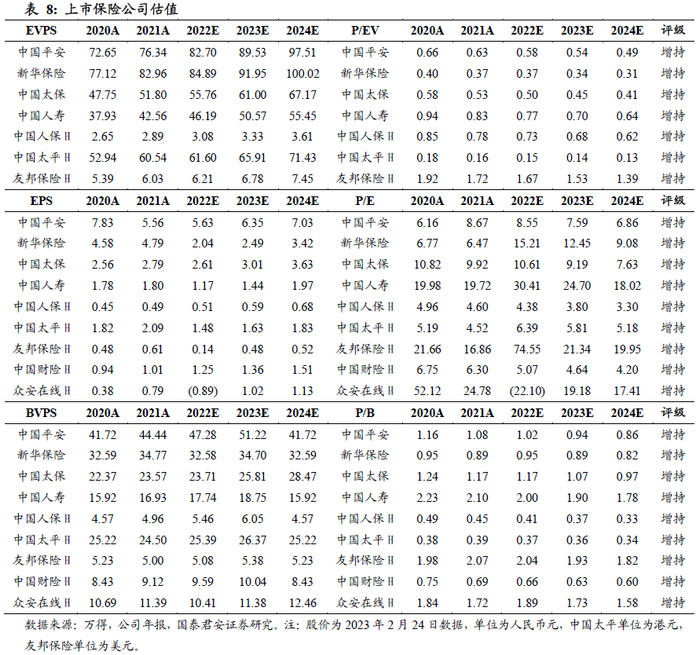 新单及新业务价值率双重压力下预计22年NBV仍然深度承压。整体上,随着客户下半年对保险财富管理类产品的需求旺盛,主要上市险企下半年NBV呈现改善态势,但各家公司的策略因素对全年NBV也有一定影响。其中中国太保在长航行动的转型战略下更加强调年度间的业务均衡,因此大幅延后了23年开门红的启动时间,推动22年NBV在三四季度明显改善;而中国人寿业务节奏主要倾斜前三季度,四季度重心已切换23年,因此预计四季度NBV增速有下滑趋势。我们预测上市险企22年NBV增速分别为:友邦保险(-6.5%)>太平寿险(-19.4%)>中国人寿(-19.7%)>中国平安(-25.2%)>太保寿险(-32.4%)>人保寿险(-34.1%)>新华保险(-61.5%)。