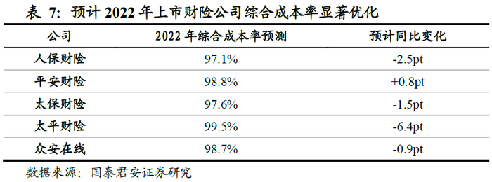 疫情封控下车险赔付下降是22年财险承保盈利改善的核心超预期,预计头部险企COR明显改善。22年受制于疫情影响部分地区限制车辆出行,被动形成了车险车险赔付低于正常年份水平的情况,推动财险行业承保盈利改善。上市险企中,我们预计平安财险综合成本率有所抬升,主要原因是陆金所的保证险业务在疫情反复的影响下面临较大的赔付压力。我们预测上市险企22年综合成本率分别为:人保财险(97.1%,-2.5pt)、太保财险(97.6%,-1.5pt)、众安在线(98.7%,-0.9pt)、平安财险(98.8%,+0.8pt)、太平财险(99.5%,-6.4pt)。