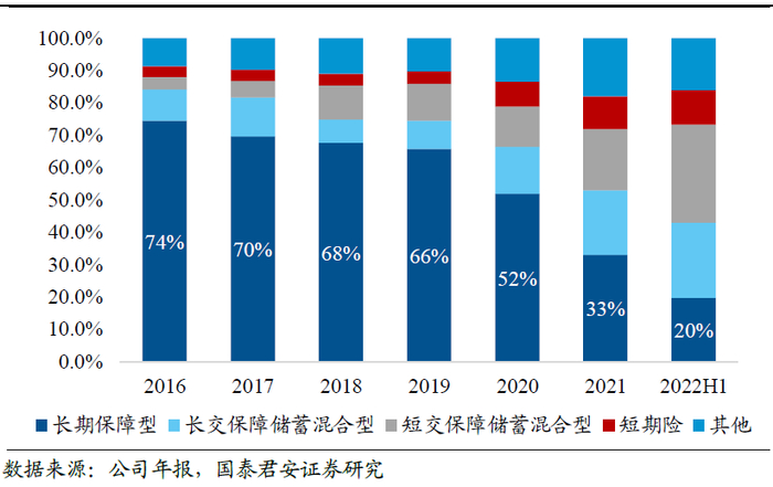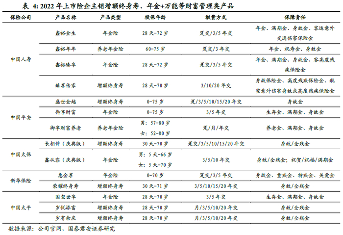 理财类险种是22年主销的产品类别,重疾险需求进一步被挤压,产品结构的变化导致新业务价值率继续下滑。在权益市场波动以及银行理财产品破净的影响下,22年以来客户对于保险理财类产品的需求旺盛,因而保险公司主销年金+万能、增额终身寿等财富管理类产品;但与此同时,高价值率的重疾险的需求进一步被惠民保等产品所挤压,产品结构的调整使得上市险企22年新业务价值率均面临下行压力。